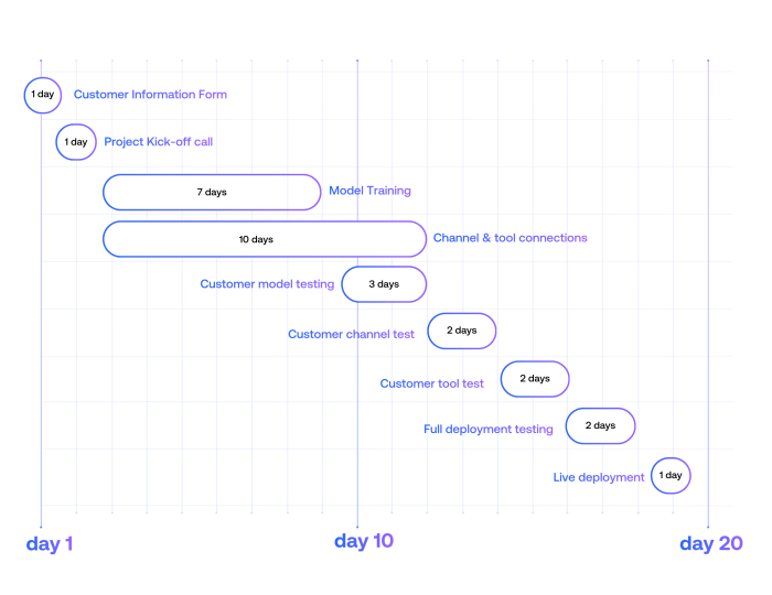 We follow a structured 2-phase, 20-day implementation plan. This includes five days of strategy mapping, a 10-day integration and training window, and a final five-day validation and launch phase.