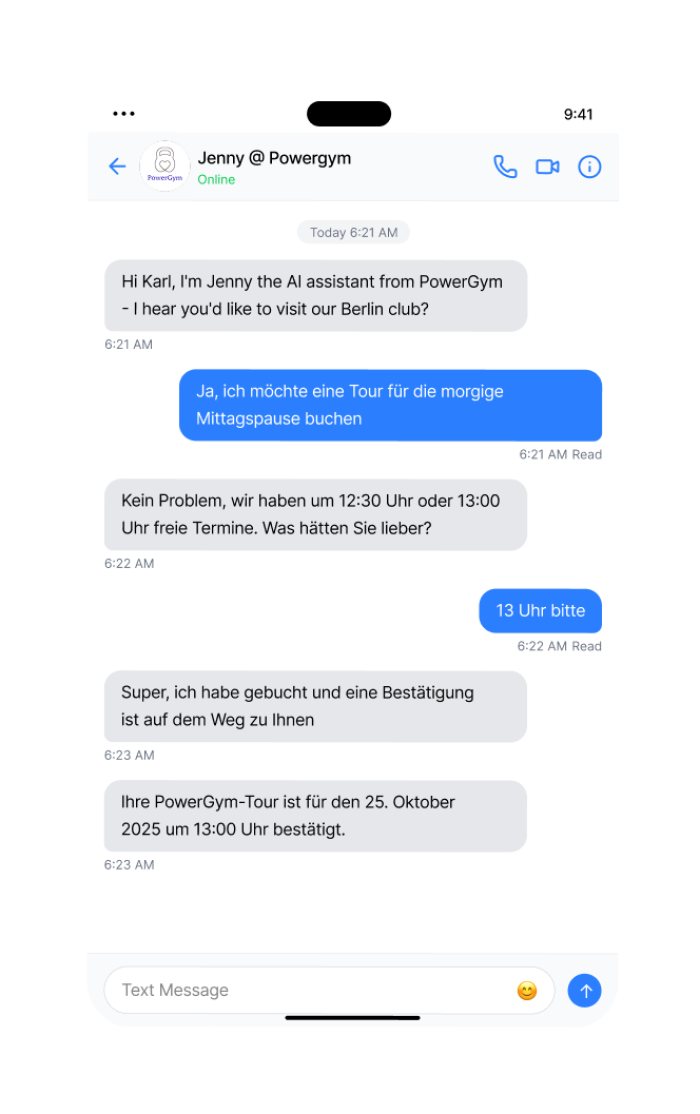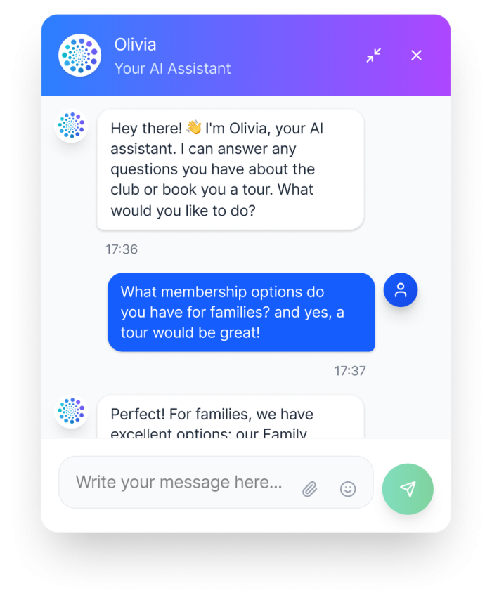 Sign up to our immersive demo experience and you’ll step straight into a live conversation with 'Olivia' - one of our AI Sales Agents. Quiz her about her capabilities and then book your demo call with one of the team - exactly the same way your gym prospects would book a tour or trial! Keep your phone handy, she’ll be calling you shortly!